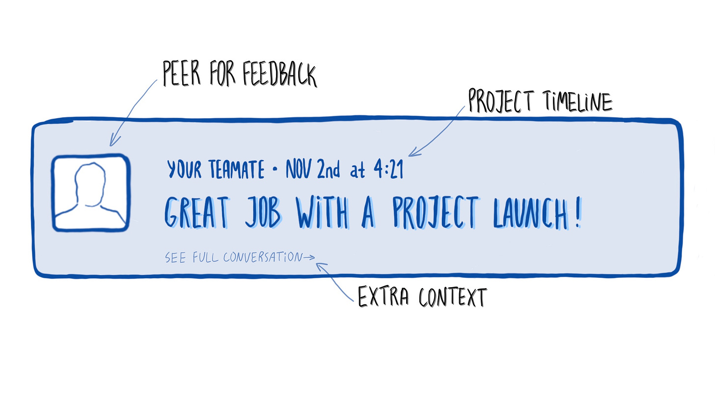 Twice a year, I sit down to write my performance review at work. It's often hard to remember what, when, and how, especially when companies grow quickly with little time to reflect on our contributions. A better way is to collect feedback and praise as they happen. For example, I bookmark Slack messages with praise: it shows who gave me feedback, when and extra context I can always go back to.