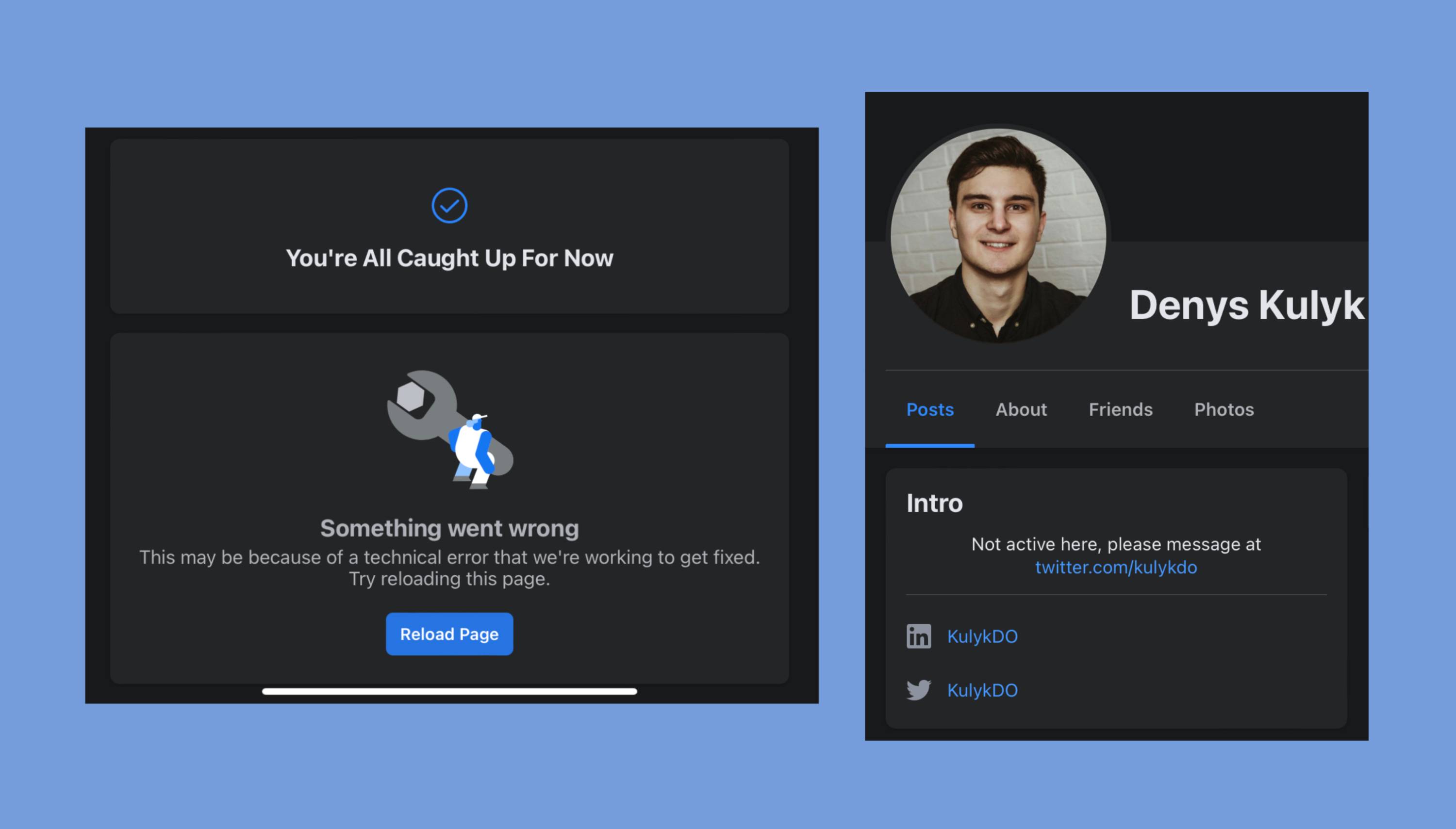 (left) once you start aggressively unfollowing people - facebook says “you’re caught up” and thinks something is broken. (right) redirect notice in bio.