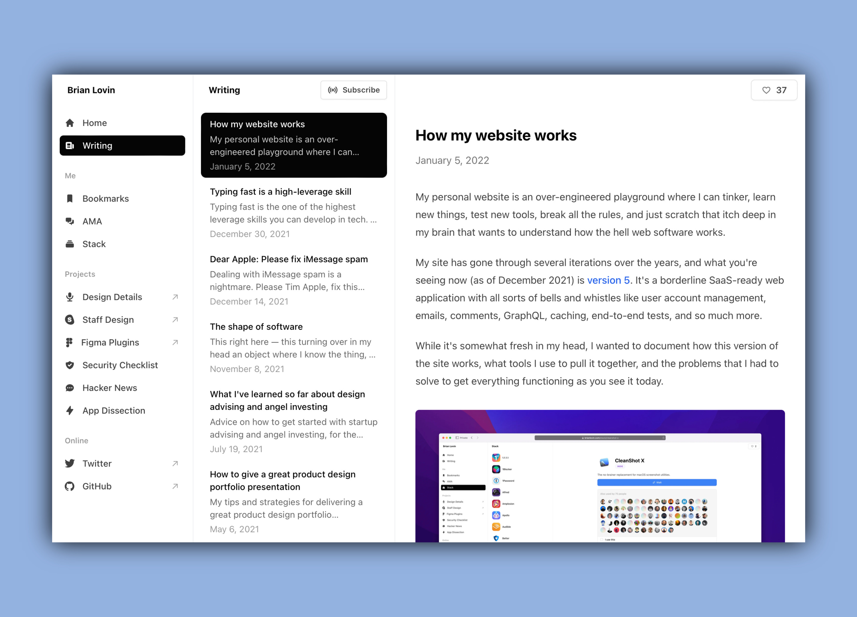 For example, Brian Lovin created an entire web application to capture his online presence, skills, and interests - mindblowing - brianlovin.com